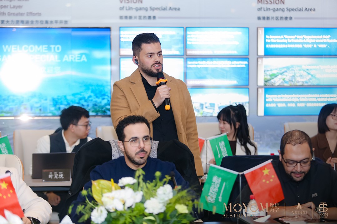 下午,访问团来到外滩22号上海亚柏医疗美容医院进行参观,在临港集团的支持下,于六楼临港外滩会议中心与中方代表关于医疗美容领域、美学领域、地域文化审美、经济发展以及未来技术交流合作等多个角度进行了深入交流探讨。上海临港集团首席财务官、临港海外公司董事长杨菁女士出席并致欢迎辞。会上摩漾生物董事长林光明先生、摩漾生物医学市场部总监丁研赟女士、上海亚柏医疗美容医院刘茜元技术院长等分别为在场来宾介绍了摩漾生物的创新科研新品以及幽抚兰产品在临床运用上的优秀表现,并向沙特代表团分享了中式审美下的东方美学概念。