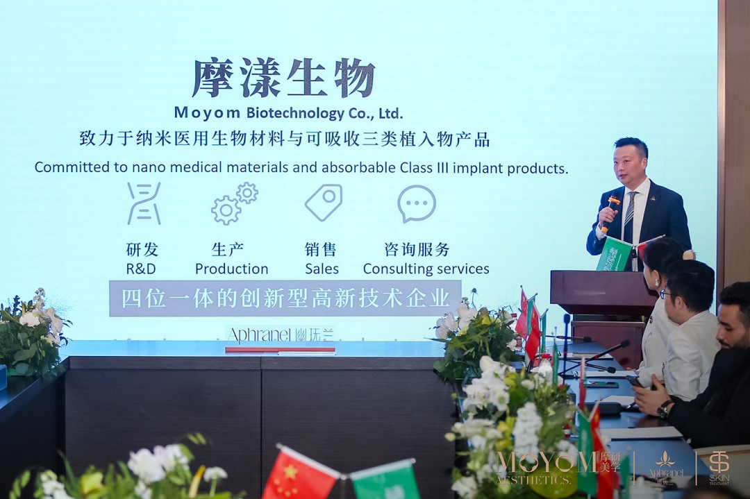 摩漾生物作为中国医美企业的代表,在中国和沙特两地市场具有独特优势。其产品和技术在市场上备受认可,特别是在再生注射领域。摩漾生物通过技术创新推出了全新可植入再生医用生物材料产品:幽抚兰CaHA(羟基磷酸钙),并即将获得国内首个三类医疗器械注册证,这款材料在全球市场上受到各国整形外科医生的喜爱。
